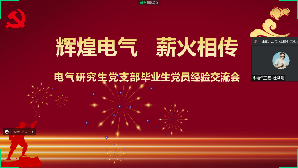 为庆祝中国共产党成立101周年,欢迎新发展党员加入党支部,同时发挥毕业生党员的榜样作用,7月1日晚,电力学院党委电气研究生党支部召开“辉煌电气 薪火相传”毕业生党员经验交流会。