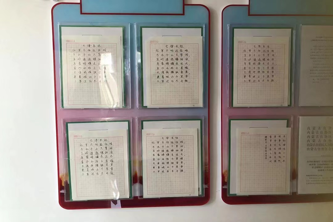 党支部全体成员认真学习了毛泽东同志诗词,重温了20世纪中国革命历史的波澜壮阔与沧桑巨变。在内蒙古自治区教育学会书法教育专业委员会副理事长、beat365党委学生工作部张智老师的指导下,支部全体成员根据自己的学习和理解,纷纷书写红色革命诗句。