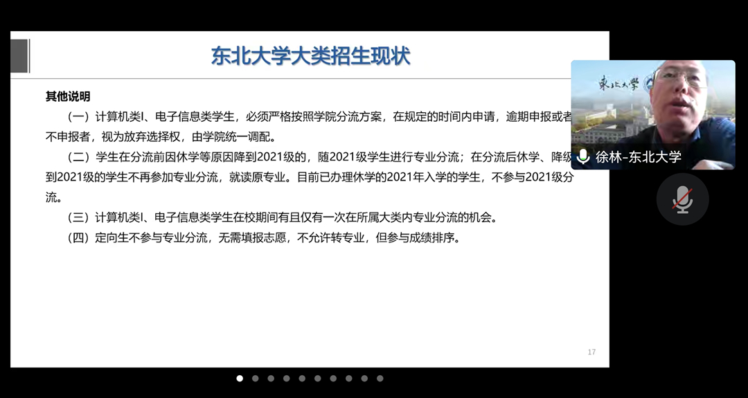 东北大学教务处副处长徐林教授作专题报告。徐林以“大类招生的几个关键问题”为题,解读大类招生的内涵特点、实施模式等,同时紧密结合东北大学多年开展大类招生培养情况,对专业类如何选择培养方案如何调整专业分流模式大类招生是否对工程教育认证有影响等若干关键问题进行分析讲解。与会人员认真听讲、积极参与,针对大类招生的问题疑惑与徐林进行充分交流讨论。