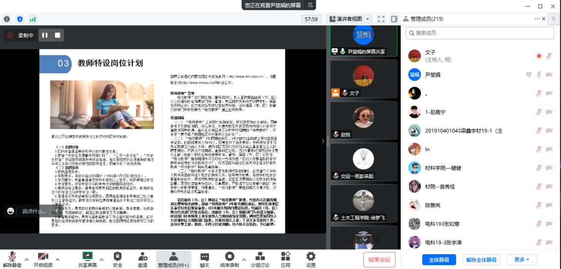 三位校友曾分别被评选为“闪亮的日子,青春该有的模样——基层就业大学生典型”“筑梦青春,不负韶华——内蒙古自治区高校基层就业典型”,他们在基层工作中取得了优异成绩,获得了广泛好评。讲座中,他们就基层就业的政策支持与发展选择、个人工作情况与成长经历、备考经验与注意事项等进行分享,通过个人经历、感受鲜活呈现了基层沃土成长发展的广阔天地与忙碌充实的奋斗青春。