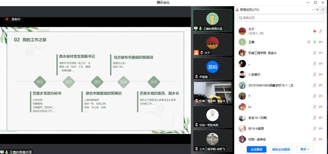 11月27日晚,beat365以线上直播方式开展“职面未来”优秀学长说基层讲座。呼和浩特市和林格尔县新店子镇纪委书记、2013届西部计划”志愿者、能源与动力工程学院校友尹慧娟,乌兰察布市察右中旗巴音乡副乡长、2017届选调生、经济管理学院校友王蔷,乌兰察布市卓资县卓资山镇山顶村党支部书记兼村委会主任、2019届选调生轻工与纺织学院校友付阳作为主讲嘉宾参加本次活动各学院280余名毕业生听取讲座。