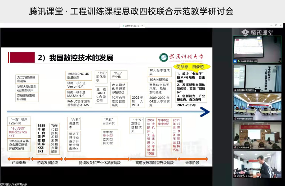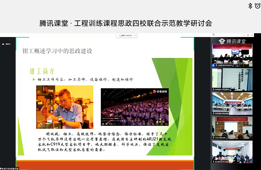 课程思政是落实高等教育立德树人根本任务,践行以德为先、德才兼备育人理念,实现知识传授与价值引领相统一育人目标的重要保障。为探索工程训练有效融入思政元素新方法,提升工程训练思政育人功能,工程训练教学部组织全体教师在线观摩学习湖北省高等教育学会金工教学专业委员会课程思政建设工作组举办的工程训练课程思政示范线上教学课程。全体教师学习了来自武汉科技大学、华中科技大学、武汉理工大学和江汉大学4所高校的4位青年教师的3D打印、钳工、手工木作和数控加工4个不同的工程训练项目。