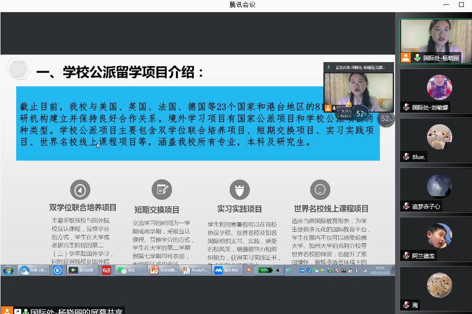 11月18日、22日国际合作与交流处举办第三期“工大·视界”系列讲座,围绕国家留学基金委公派出国(境)学习交流项目、学校公派出国(境)学习交流项目分别线上举行两场讲座。