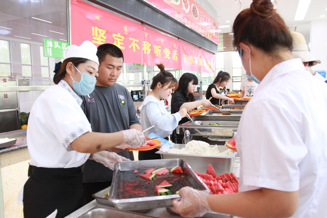 今年的毕业餐别开生面,气氛热烈,场面隆重。秩序井然、铮明瓦亮、布局整洁的八组自助餐台让就餐的同学们眼前一亮,加上丰富可口的饭菜、热情细微的服务,同学们大呼满意,并表示这才是让我们永远留在记忆里的母校的味道。全方位有温度的服务引来同学们的欢声笑语,让同学们流连忘返,久久不肯离去。“再见了,毕业生同学们,阿姨、叔叔会想念你的!”这句朴实无华、发自心底的留恋,更让同学们感动的留下了泪水。