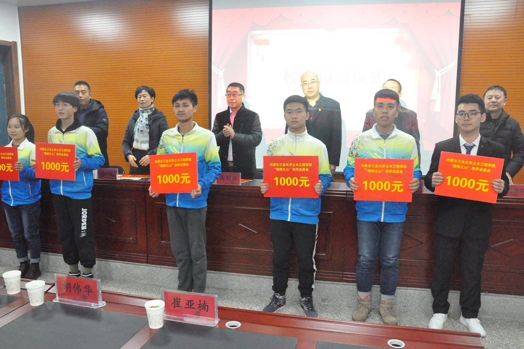 本次“路桥之心”助学金经学生申报、学院审核评审委员会评审共确定李华龙等12家庭贫困、成绩优异的学生获得资助。仪式上那音巴雅尔宣读受助学生名单。王利明高剑云、王明、那音巴雅尔、王岚、陈辉为受助学生颁奖道桥17-2班李华龙代表获资助学生发言。