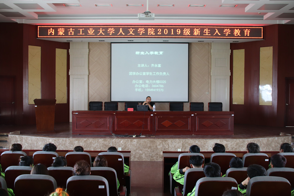 9月9日上午人文学院在电力大楼十楼报告厅举办2019级新生开学典礼暨入学教育大会。学院党总支书记马利强院长文宗川副院长苏丽娜部分教师代表参加会议。