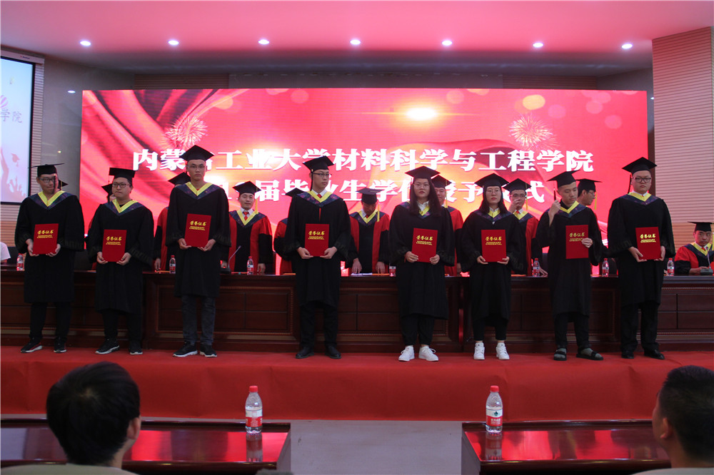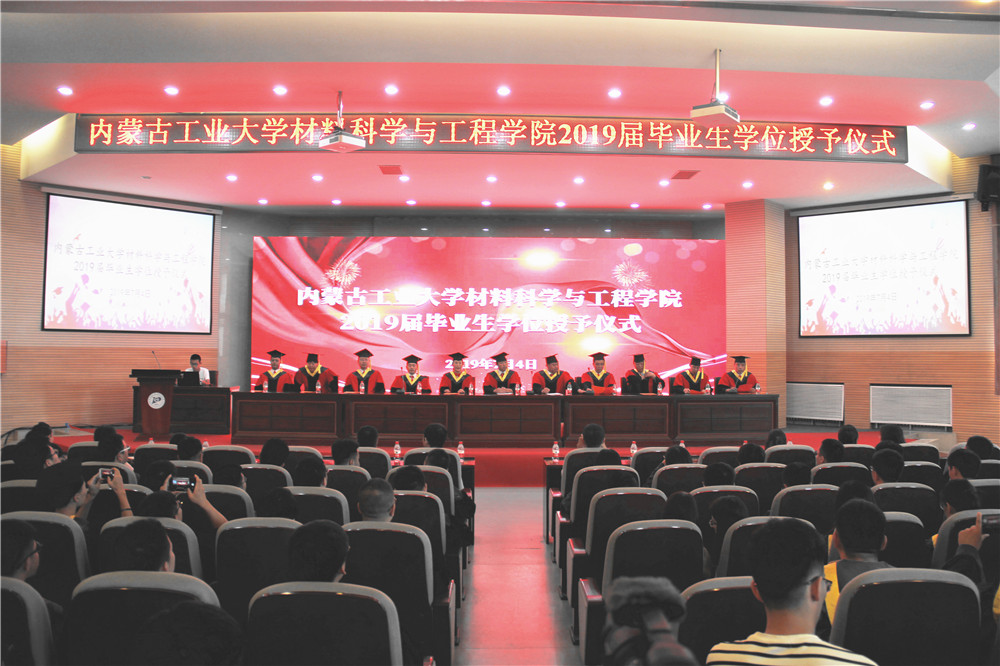 7月4日上午材料科学与工程学院在第三教学楼报告厅举行2019届学生学位授予仪式。学院党政领导干部,内蒙古机电职业技术学院冶金与材料工程系主任李颖,学院学位委员会成员各系主任、行政部门负责人,部分硕士、博士生导师,各毕业班班主任辅导员以及全体毕业生参加本次学位授予仪式。学院党委副书记、副院长吕凯主持仪式。