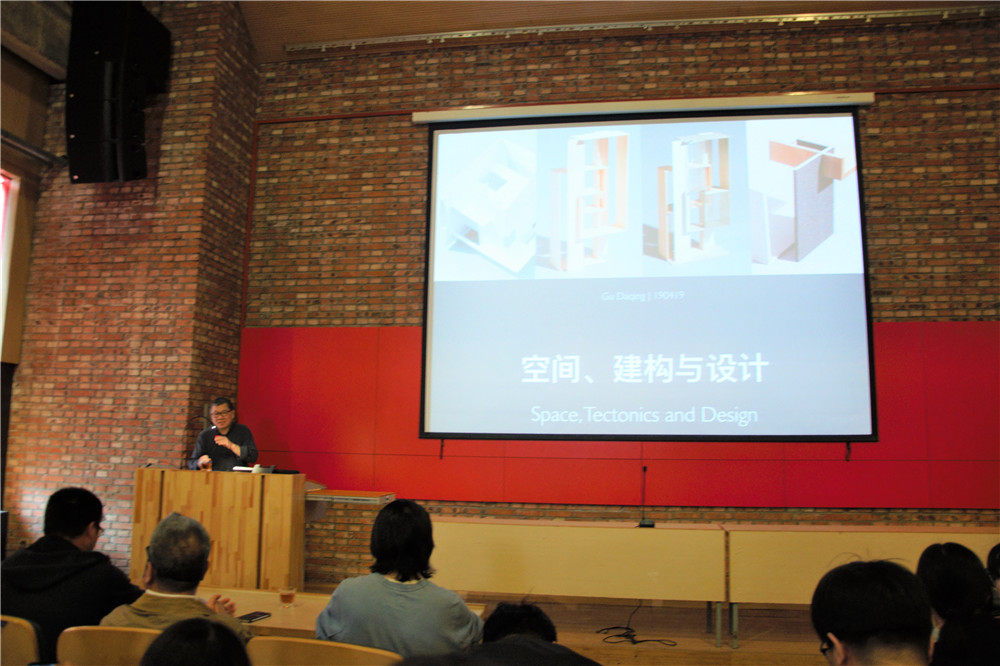建筑馆李大报告厅顾大庆为学院师生作题为建构、空间与设计的学术讲座自己三十余载的基础教学研究为背景,详细介绍了在香港中文大学执教25年的教学成果针对主持的“建构工作坊”的相关教学内容,与参会师生进行了交流