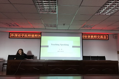 1019日下午,外国语学院在金川电力大楼举办2017年出国培训教师学习交流会。孙磊、魏圆圆、杨婧、阿古达木四位教师分享了自己的学习心得和感悟。会上,还传达了学校审核评估迎评动员大会会议精神,并就下一步工作进行了深入的安排和部署。
