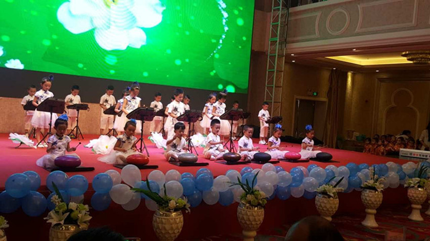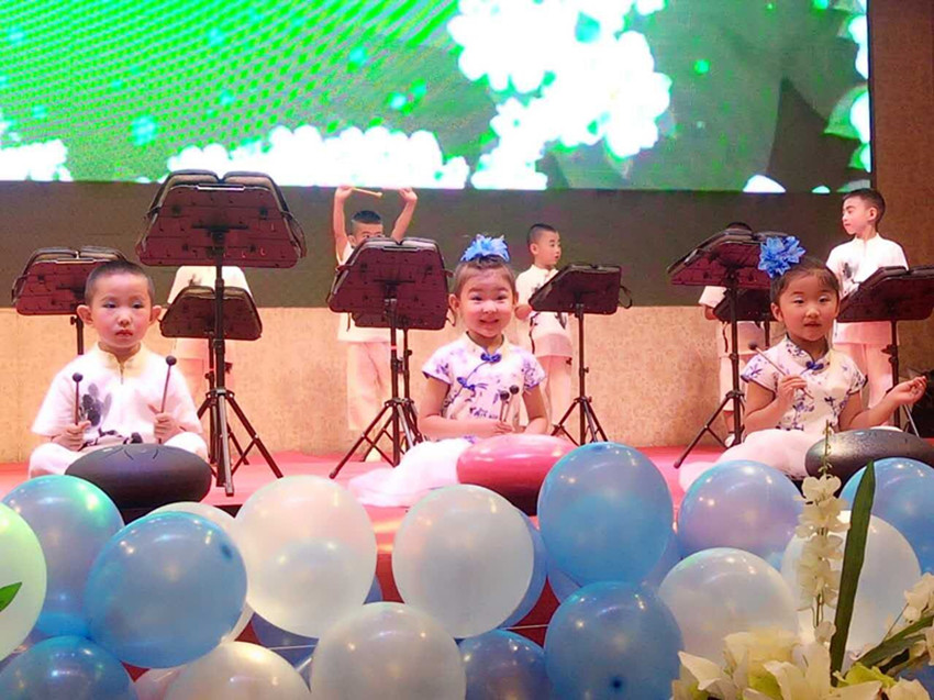 金川校区幼儿园小朋友的参赛曲目是江苏民歌《茉莉花》,孩子们用由古代乐器编钟演变而来的玄空鼓和小钟琴相配合,婉转悠扬的演绎了这首小调民歌。