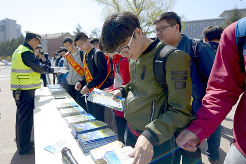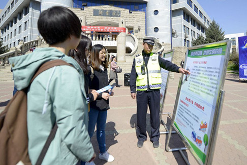 427日上午,武装保卫处和理学院联合新城区交警大队第五中队、在新城校区共同举办“遵守交通法规,创建平安校园”道路交通安全知识宣传活动,为创建平安和谐的校园交通环境发出倡议。