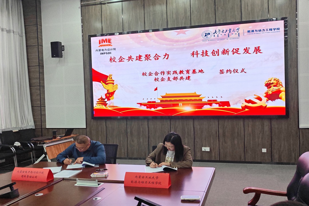 近日,能源与动力工程学院热能与动力工程系教工党支部与内蒙古电力勘测设计院有限责任公司信息科技党支部、发电党支部合作共建暨实践基地签约仪式在金川校区能动大楼举办。电力设计院信息科技党支部书记、信息工程分公司经理杨承国,发电党支部书记、发电工程分公司副经理杨殿臣和学院党委书记陈辉,党委副书记、副院长臧琛,副院长马剑龙、王亚辉出席签约仪式。