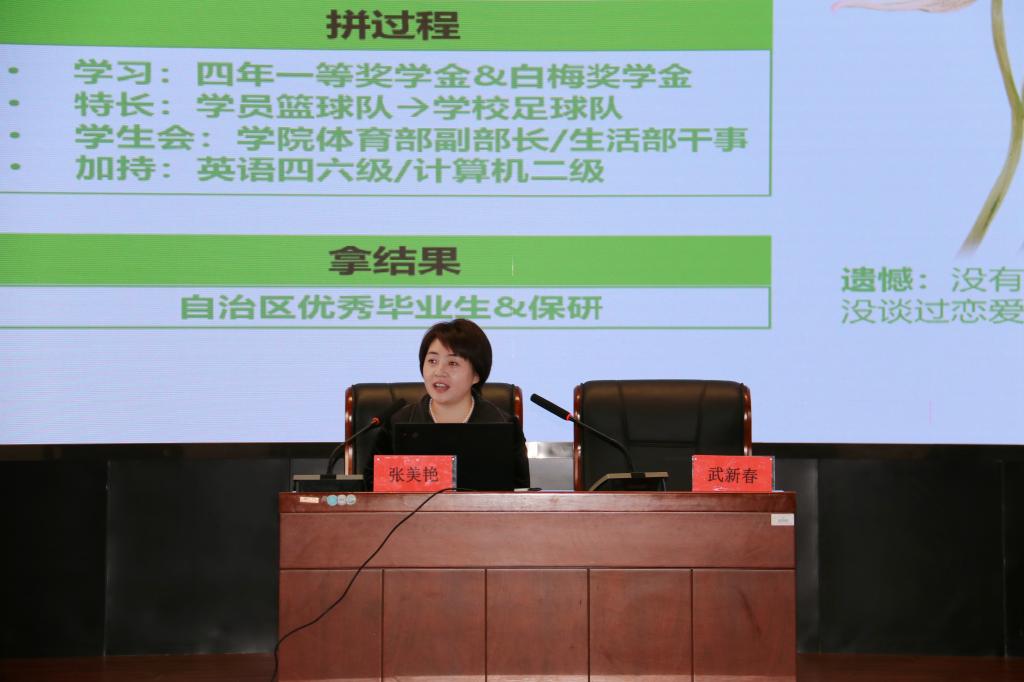 张美艳《一个平凡学生的筑梦之路》为题作专题报告回忆了在母校的学习、成长经历,感谢老师们的辛勤教诲和母校的精心培养并分享自身成长和工作经历为学弟学妹们提供经验启示本次讲座引起了同学们的共鸣,为同学们进一步做好职业生涯规划提供帮助,起到了良好的教育和引导效果