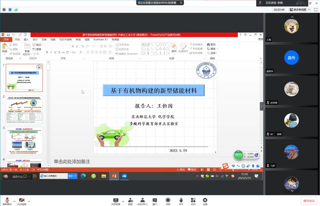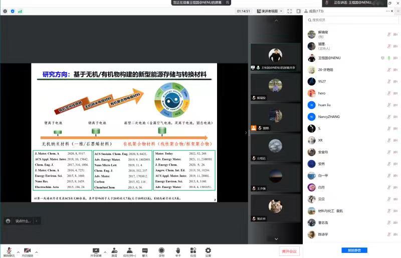 王恒国教授作了题为“基于有机物构建的新型储能材料”的讲座。他指出,新型储能材料对于“碳达峰和碳中和”的实现具有重要意义,有机电极材料是一类具有广泛应用前景的储能物质,属于新一代绿色电池的研发前沿与重点。随后王恒国教授介绍了n/p型及双极性有机物存储阴阳离子的作用机制,探讨了全有机电池和双离子电池,并表示其相关成果为有机物的工作机理研究、有机电极材料的设计与合成提供了重要借鉴。