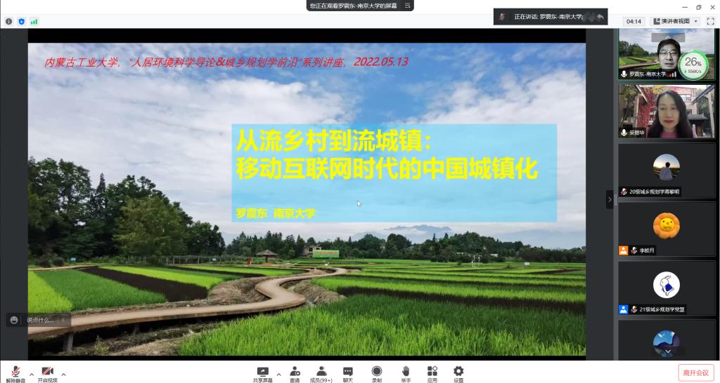 讲座中,罗震东教授从定义流乡村、重构城镇化、发现流城镇、新兴田园城市4个部分进行了讲授。罗教授认为,互联网的飞速发展,为城镇化的多元路径提供了可能,乡村可以因流量加持变为流乡村,继续发展成为流城镇,然后转变为城镇,改变了从乡村直接变化为城镇的路径。新兴田园城市规划应注重制度设计,未来城市规划不再是简单的空间理论,包含基础的支撑体系、中间维度的空间设计、顶层的制度设计。城市规划转变为公共政策,未来的城市规划实践应包括制度设计和制度创新的能力。罗教授的讲座为同学们更系统、更深入学习城市规划知识提供了新的思路和方向。