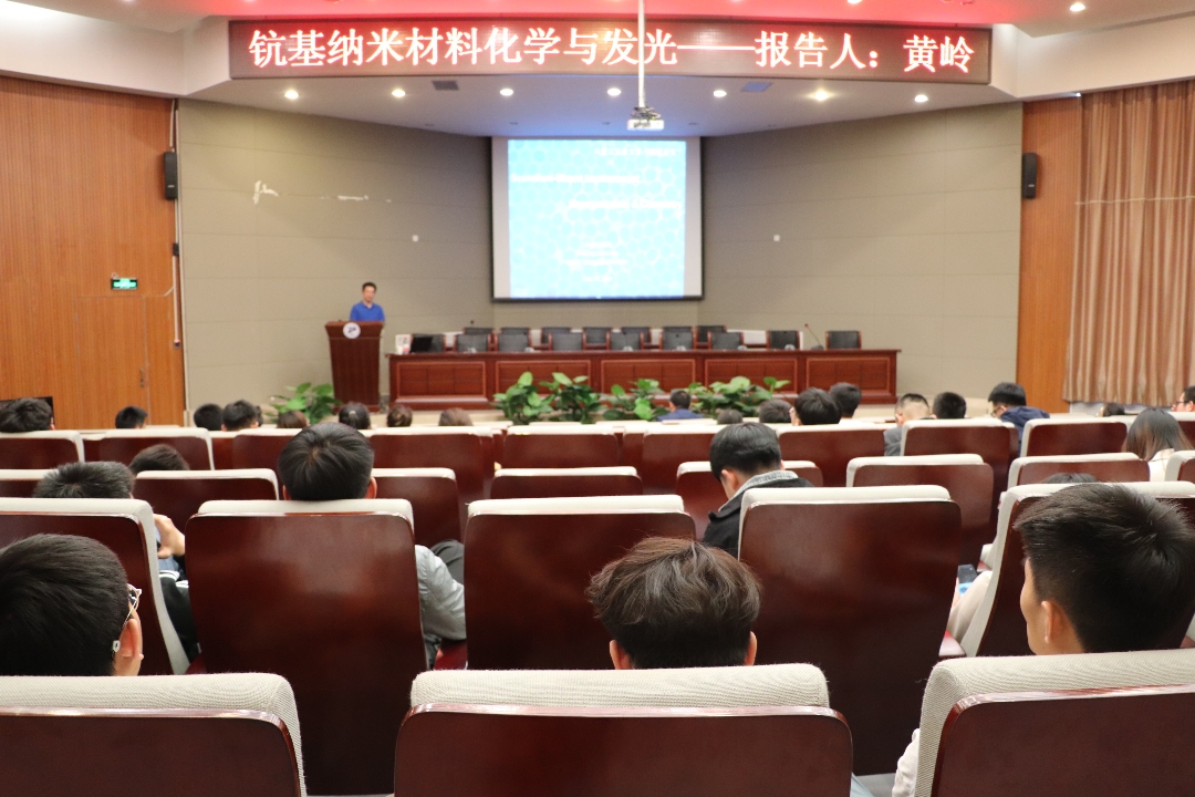 讲座中,黄岭教授对钪基纳米材料化学与发光专题的研究方向、科研课题、研究成果发展势态了详细介绍,向大家阐释了“化学始终要以实验为准”“发现就在转瞬间”的科学精神并围绕更加开放性的、多方面的纳米材料与发光课题与老师、同学进行了互动交流。