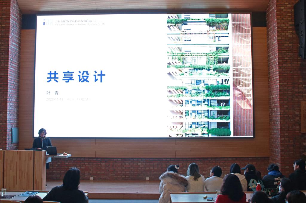 讲座中,叶青共享设计”为题,阐述了共享设计的发展历程,总结绿色建筑的信念列举建科大楼和深圳湾科技生态园两个绿色建筑实践案例从诊断、策划、创意设计、工程设计、评估反馈五个方面介绍了共享设计的步骤,指出建筑师以人与社会自然的共享使用者办公与生活感受来进行项目规划与建筑设计。