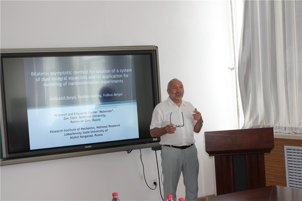 Sergei Aizikovich教授详细介绍了功能梯度材料接触力学研究领域的最新进展和功能梯度材料弹性问题的理论分析方法,围绕功能梯度材料前沿问题,结合研究实例和研究成果阐述了该领域的热点研究,并对未来功能材料接触力学进行了展望。Boris Mitrin副研究员介绍了自己在磨损状态下滑动热弹性摩擦接触问题的研究工作。两场讲座内容丰富,具有极强的学术前沿性,学术交流气氛浓厚。