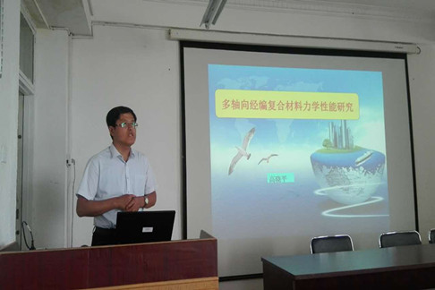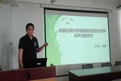 高晓平老师作了题为《多轴向经编玻纤增强复合材料力学性能研究》的学术报告,介绍了多轴向经编织物特点,并结合自己的科研经历阐述了以多轴向经编织物为增强体、树脂/固化剂混合液为基体应用真空辅助成型复合材料的成型工艺、拉伸和弯曲性能,分析了纤维排列对复合材料性能的影响;陈晓东老师作了题为《机敏型复合材料》的学术报告,介绍了智能纺织品开发的基本思路,以及机敏材料的结构与性能;陈思老师作了题为《经编间隔织物增强聚氨酯复合材料吸声性能》的学术报告,阐述了经编间隔织物增强聚氨酯复合材料在1006 300 Hz 的声波范围内的吸声性能,以及织物结构变化对复合材料吸声性能的影响。