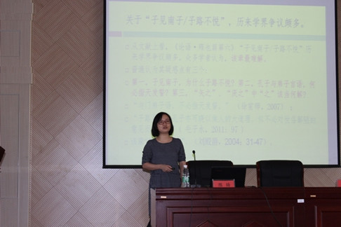 此次报告会邀请了华南农业大学陈旸教授和江西师范大学Gretchen Nauman博士主讲。陈旸教授以系统功能语言学为理论基础,以语篇分析为研究方法,系统地讲解了对典籍《论语》中“子见南子,子路不悦”的英译问题。Gretchen Nauman博士结合自己在中国从事英语教学20余年的经历,就中国外语教师职业发展的模式、为什么教师需要职业发展以及教师如何进行职业发展等问题的研究进行了深入的阐释。