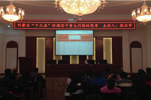 张永军博士以《内蒙古“十三五”时期若干重大问题的思考》为题,针对我区面临的各种经济挑战以及应对策略进行了详细的讲解,以经济新常态、“稳增长”、“调结构”、“惠民生”、“补短板”为题分别对目前我区经济社会发展的现状、存在的问题以及在“十三五”期间应对策略进行了分析。
