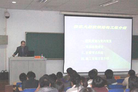 杨蔚彪教授在报告中介绍了国家大剧院钢结构、中央电视台新台址钢结构,国家体育场钢结构等项目。讲座结束后,杨蔚彪教授与同学们进行了互动。