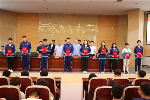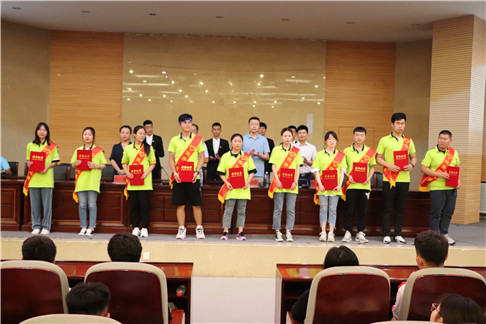 团学辅导员张宇对本学期学生工作进行总结并强调了考风考纪的重要性。团委书记任敏作暑期三下乡社会实践活动动员讲话。团学办公室主任胡宇强宣布荣获学院2018-2019年优秀志愿者名单。学院青协志愿者鲍世成作为志愿者代表发言,并对2019年暑期三下乡具体细节解读。院领导、教师代表向暑期“三下乡”志愿者授旗,为获得2018-2019学年春季学期优秀班集体的班级代表颁发荣誉证书,为获得优秀志愿者称号的大学生志愿者颁发奖状,鼓励同学们再接再厉,争取更好的成绩。