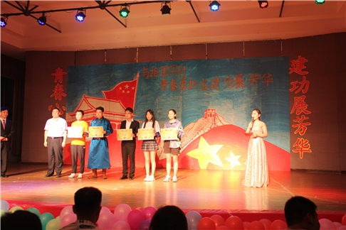 晚会中,分别对前期征集的非舞台类作品和比赛中的舞台类作品进行了颁奖。通过微信线上投票及线下评审,武佳丽、李政德等7名同学的书法、绘画、摄影等作品在非舞台类作品评选中获奖。舞台类作品中,蒙古族歌曲《希格日希格日》获得一等奖,舞蹈《目不转睛》、《Dance to beautiful youth》以及诗话剧《你的模样》获得二等奖,蒙古族群舞《bomba》、朗诵《五四心 时代梦》等5个节目获得三等奖。