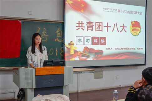 信息工程学院团委书记赵智琦领学了团的十八大的会议概况中央致辞解读了大会报告和新修改团章。希望同学们坚定理想信念、练就过硬本领、勇于创新创造、锤炼高尚品格,在弘扬和践行社会主义核心价值观中实现自己的个人价值。