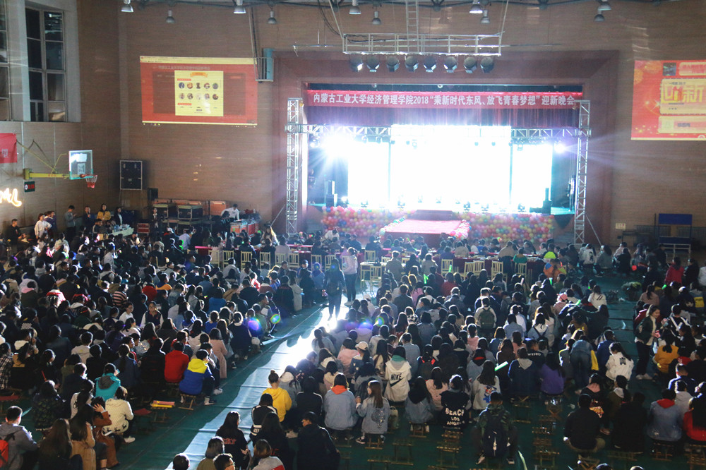 928日晚,经济管理学院新城校区文体馆2018年“乘新时代东风,放飞青春梦想”迎新晚会。学院党委书记任慧,副书记、副院长冀强,各系主任,2018级班主任、教师代表,2018级全体新生以及兄弟学院学生代表观看晚会