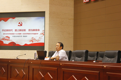 学习贯彻党的十九大精神”全区高校优秀辅导员校园巡讲团成员、第四届全国高校辅导员年度人物、内蒙古农业大学后勤管理处副处长韩瑞平“开启新时代 踏上新征程 担当新使命为题作宣讲报告阐述了一个思想两个没有变三个意味着、四个基本依据五个本质内涵重要意义,回顾了我国过去五年发生的历史性变革。指出,从党的十九大到二十大,是“两个一百年”奋斗目标的历史交汇期,大家要不忘初心,牢记使命,以新姿态迎接挑战,以新状态踏上新征程。他号召同学们爱国、励志、求真、力行,在实现中华民族伟大复兴中国梦的进程中贡献应有的力量,交出不负时代不负青春的满意答卷。