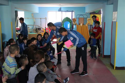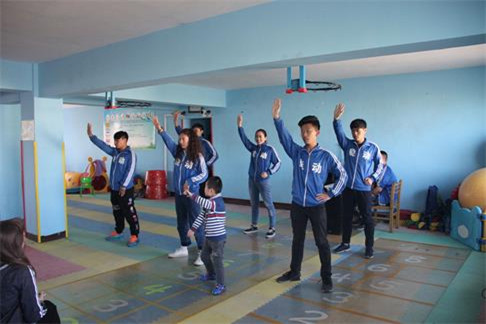 学生代表在康复中心教师的引导下,通过谈心、歌舞表演、趣味游戏与孩子们进行互动,并将小礼物分发给他们,孩子们脸上洋溢着幸福的微笑。