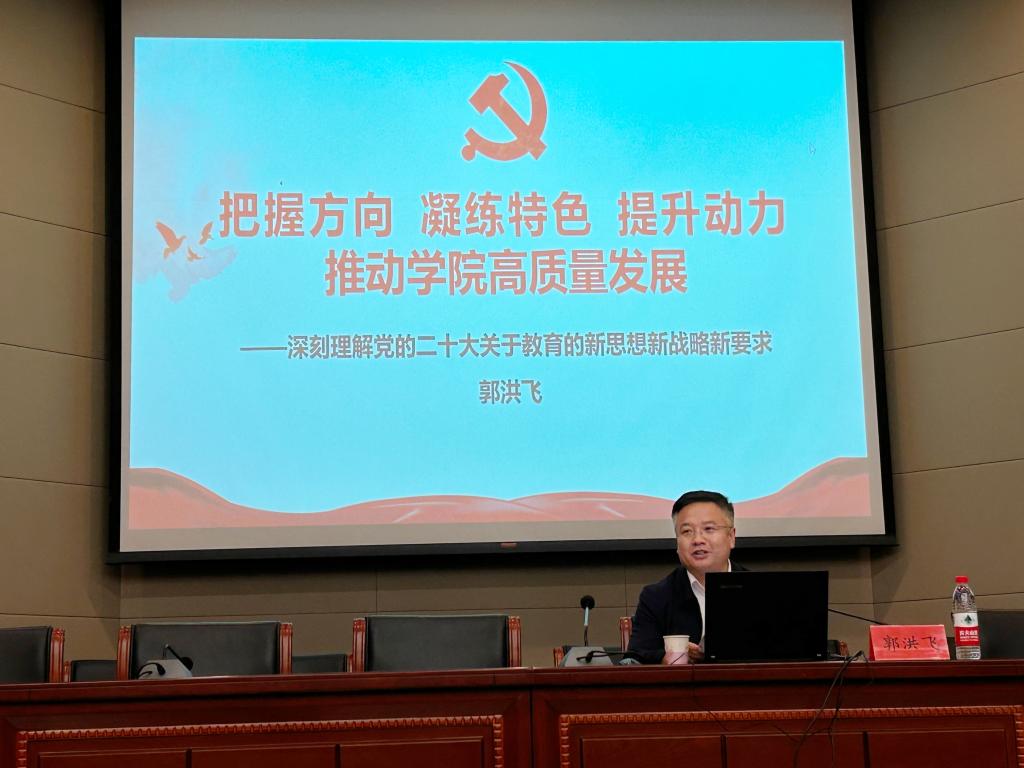 郭洪飞从深刻认识统筹推进教育、科技、人才战略部署的重大意义,科学认识三者关系,提高政治站位、坚守初心使命和打赢教育科技人才协同攻坚战四个方面进行详细解读。他勉励师生要以成效论发展、以成效增信心,要有思考力,更要有行动力,要围绕自治区“两件大事”,主动对标学校“九大行动”,促进学院在教学成果、育人成效、科研成果、社会服务等各项工作中量质齐升。