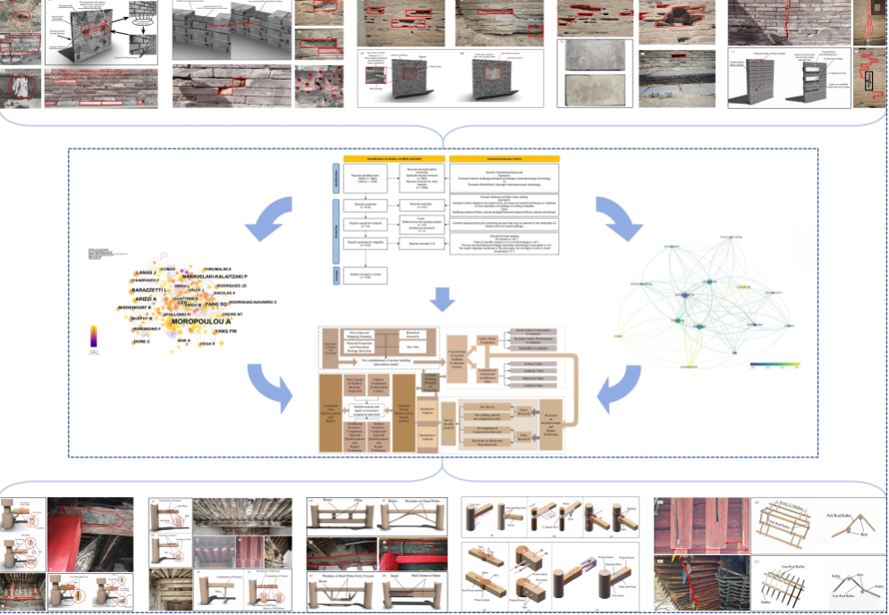 历史文化遗产承载着中华民族的基因和血脉,是中华文明连续性、创新性、统一性、包容性、和平性的有力见证。历史建筑作为文化遗产的重要组成部分,区域复杂环境侵蚀造成其出现不同病害损伤,系统研究历史建筑的病害损伤类型并构建科学修复技术体系,是守护文化遗产真实性与完整性的重要实践。在此背景下,团队利用PRISMA系统综述法,全面综述了历史建筑墙体和木构件的9种损伤形式及其对应的30余种修复技术,从新材料和新技术方面进行了系统归类,提供了一种可结合病害图例针对性明确相应修复技术的系统综述。此外,研究团队结合历史建筑修复的环境适应性,提出历史建筑修复全过程技术路线,突破传统经验保护模式,构建起从材料特性认知到防护技术研发的完整技术链,为解决西北地区 "文物保护与环境适应性" 这一关键科学问题提供了科学依据。