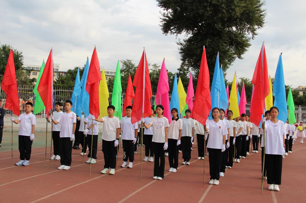 伴着激昂的音乐,国旗班的同学们迈着整齐步伐庄严入场。鼓号队、彩旗队、花束队方阵以及各级部方阵队等16支代表队,着装整齐,步伐矫健,喊着嘹亮的口号依次通过主席台。入场仪式后举行升国旗、奏唱国歌仪式。全体师生面向五星红旗,行注目礼,齐声唱响国歌,表达最崇高的敬意。