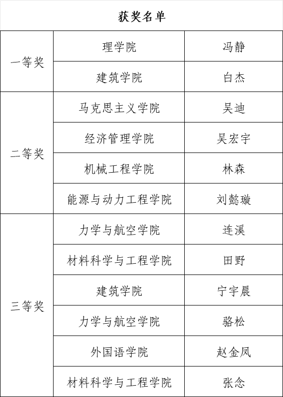经评审组严格评审,最终理学院冯静、建筑学院白杰获一等奖;马克思主义学院吴迪等4人获二等奖,航空学院连溪等6人获三等奖。冯静、白杰、连溪分别斩获理论知识、案例研讨、谈心谈话环节最佳表现奖。