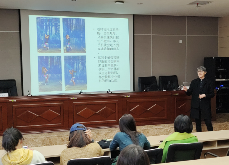 建筑学院副教授艾妮莎作讲座,从摄影构图与视角、光线与色彩、手机摄影功能、单反相机使用等方面介绍了摄影的技巧和方法,并为大家展示了部分摄影大师的优秀作品。