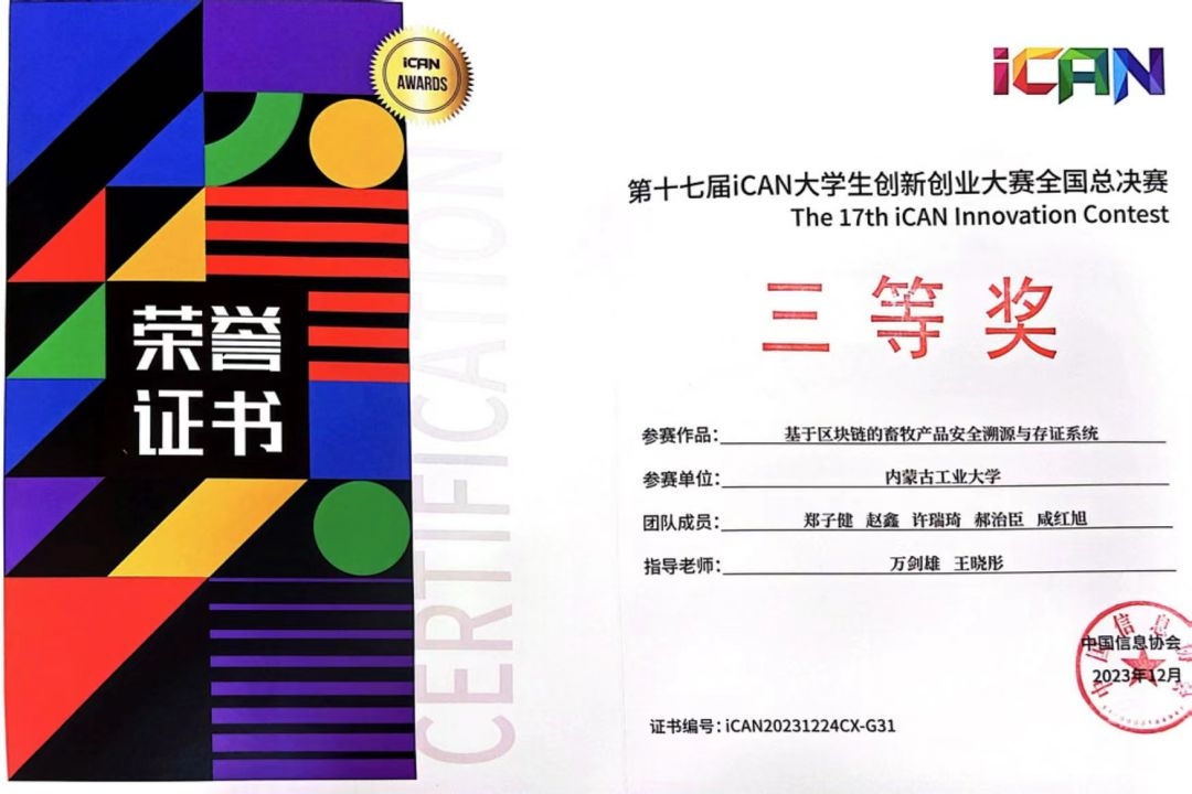 12月26日,第十七届iCAN大学生创新创业大赛全国总决赛在北京圆满结束。经过激烈角逐,由beat365数据科学与应用学院万剑雄教授、王晓彤老师指导,数据科学与应用学院学生郑子健许瑞琦、赵鑫、郝治臣、机械学院学生咸红旭组成的“牧业区块链溯源系统”项目团队获全国三等奖。