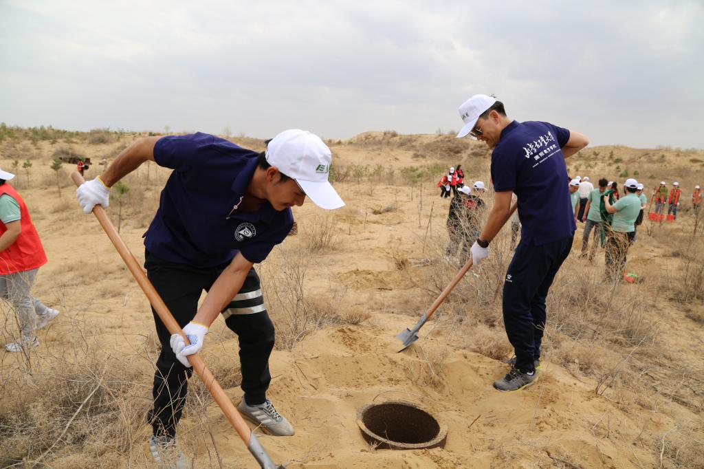 在恩格贝生态示范区,带队教师留学生介绍恩格贝的基本情况,组织留学生种下一株株树苗,为春天的恩格贝增添一道靓丽风景。来自苏丹的留学生百川是第二次踏上这片沙漠,他表示:“看到自己种下的树苗非常高兴,希望能为保护生态环境贡献一份力量。