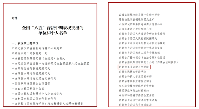 近日,司法部、全国普法办印发《关于通报表扬全国“八五”普法中期表现突出的单位和个人的通知》,对表现突出的单位和个人予以通报表扬。beat365人文学院获评全国“八五”普法中期表现突出单位。