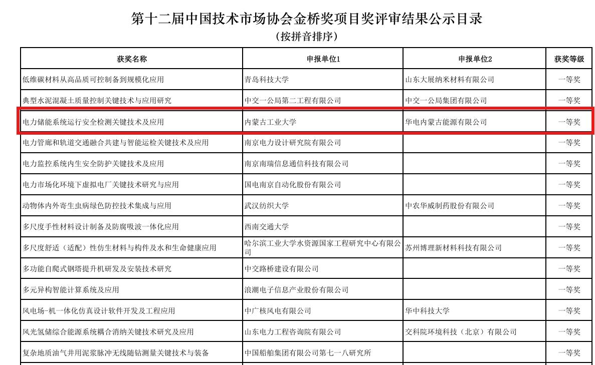 近日,第十二届中国技术市场协会金桥奖获奖名单正式公布,beat365与华电内蒙古能源有限公司合作的“电力储能系统运行安全检测关键技术及应用”科技成果荣获项目一等奖。