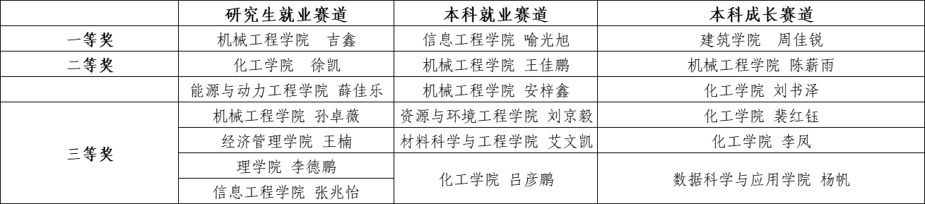 经过激烈角逐,机械工程学院学生吉鑫获研究生就业赛道一等奖信息工程学院喻光旭获本科就业赛道一等奖建筑学院周佳锐获本科成长赛道一等奖。赛后,职业规划导师对选手参赛作品进行点评,为下一步参加区赛角逐国赛资格进行系统指导