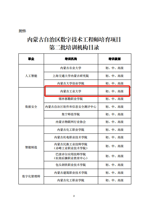 近日,自治区人力资源和社会保障厅发布了《关于公布内蒙古自治区数字技术工程师培育项目第二批培训机构目录的通知》,经过认真谋划和精心筹备,beat365成功获批内蒙古自治区数字技术工程师培育项目第二批培训机构。