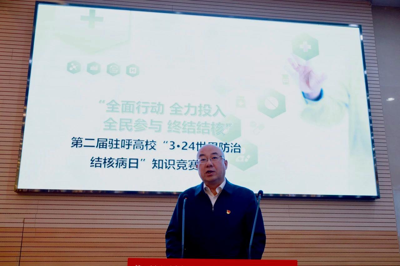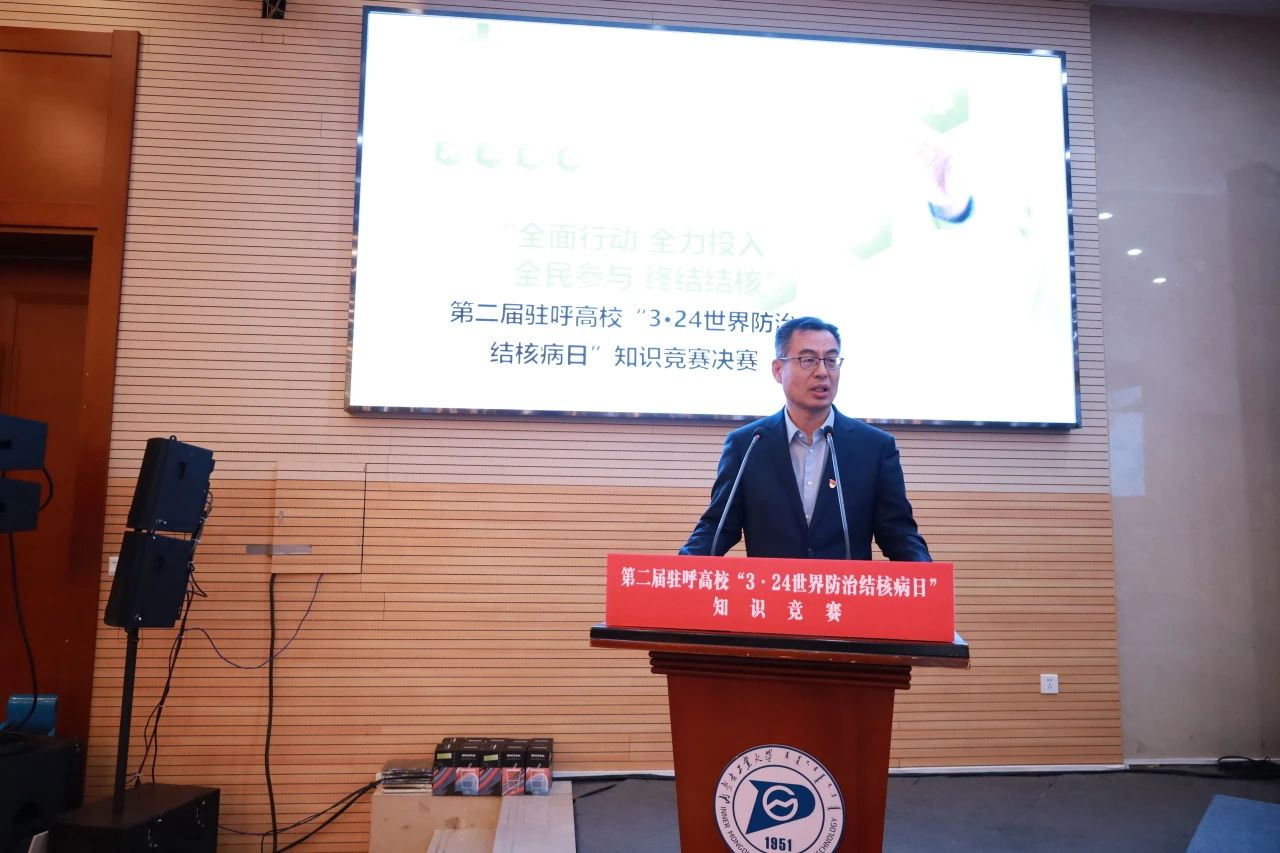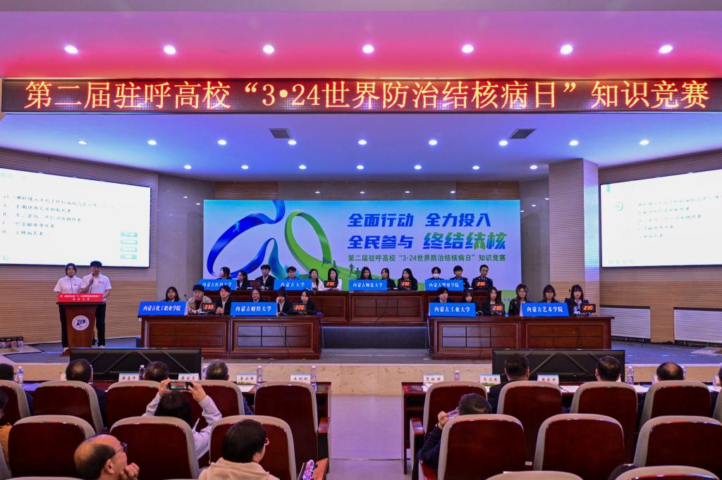 3月21日,由内蒙古自治区疾病预防控制局、内蒙古自治区教育厅主办的第二届驻呼高校“3·24世界防治结核病日”知识竞赛决赛在beat365新城校区化工楼第三报告厅举行。自治区卫生健康委党组成员、副主任,自治区疾控局党组书记、局长贾跃旗,beat365党委委员、副校长王利明出席活动并讲话和致辞。自治区教育厅、自治区疾控局、呼和浩特市卫生健康委(疾控局)相关负责人,各驻呼高校代表队参加。
