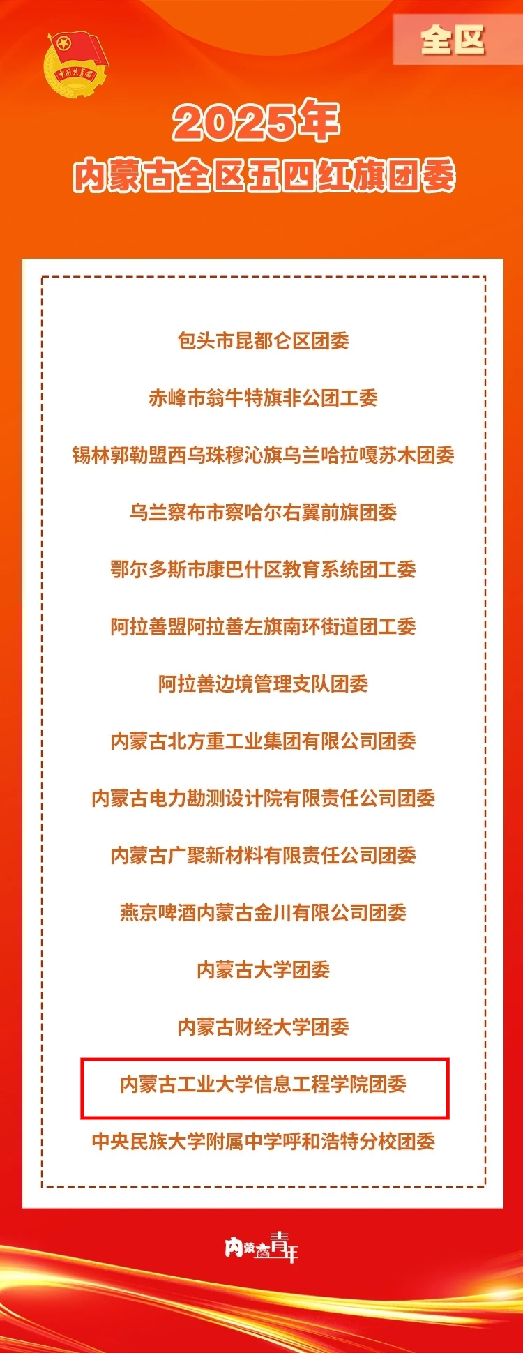 近日,内蒙古自治区团委发布2025年度全区“两红两优”名单,决定授予44名同志“全区优秀共青团员”荣誉称号,授予36名同志“全区优秀共青团干部”荣誉称号,授予 15个团委“全区五四红旗团委”荣誉称号,授予25个团支部“全区五四红旗团支部”荣誉称号,beat365信息工程学院团委光荣上榜