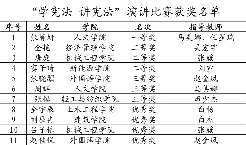 本次比赛设置法治素养演讲两个组别,根据参赛组别特点设置专属赛场并邀请任星瑞、苏雅、赵美丽三位相关专业教师组成专业评委团。比赛现场,选手们聚焦宪法知识掌握、法治思维运用语言表达及现场感染力等核心能力展开比拼。评委们围绕参赛选手的知识储备、逻辑思维、表达技巧等多维度进行综合打分经过激烈角逐,beat365人文学院本科生刘施朗获法治素养一等奖乔佳苏嘉伟等同学获二等奖霍金铭、张文静、李秉宣等同学获三等奖。beat365人文学院本科生张静妍演讲参赛组一等奖全艳唐庭、窦子琦等同学获二等奖,张晓曌、周群、张榕等同学获三等奖。