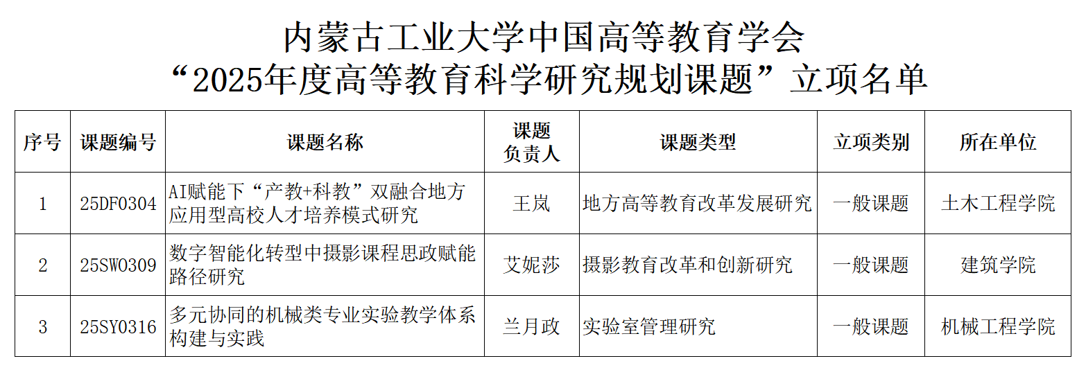 土木工程学院教师王岚申报的《AI赋能下“产教+科教”双融合地方应用型高校人才培养模式研究》获批“地方高等教育改革发展研究”一般课题,建筑学院教师艾妮莎申报的《数字智能化转型中摄影课程思政赋能路径研究》获批“摄影教育改革和创新研究”一般课题,机械工程学院教师兰月政申报的《多元协同的机械类专业实验教学体系构建与实践》获批“实验室管理研究”一般课题。