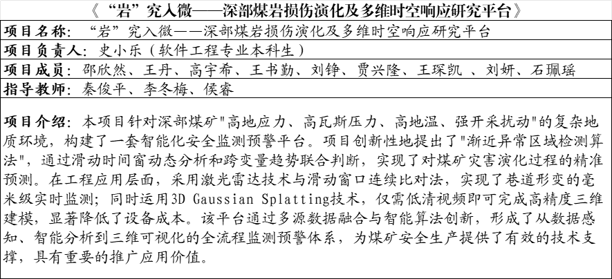 “揭榜挂帅”擂台赛是中国青年科技创新“挑战杯”专项赛之一,旨在鼓励青年学生发挥创新能力,解决国家科技需求,推动科技成果转化受到全国高校、青年科技工作者及产业界的广泛关注参赛团队将以此为契机持续优化平台功能,推动其在煤矿安全生产中的应用,为行业发展贡献智慧与力量。