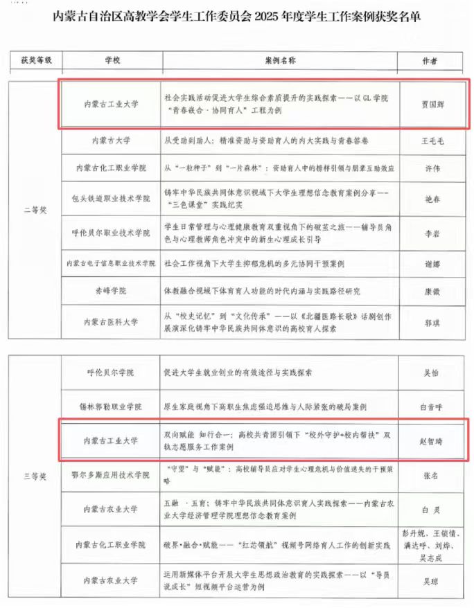 近日,内蒙古自治区高教学会学生工作专业委员会2025年度全区学生工作案例征集评选结果公布,经济管理学院辅导员贾国辉报送的思政案例《社会实践活动促进大学生综合素质提升的实践探索——GL学院“青春嵌合·协同育人”工程为例》获全区二等奖。信息工程学院辅导员赵智琦报送的思政案例《双向赋能知行合一高校共青团引领下“校外守护+校内帮扶”双轨志愿服务工作案例》获全区三等奖。