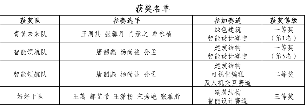 本次大赛为期两天,围绕智能建造、数字化设计等前沿主题,设置多个竞赛模块吸引全国300余所高校3000名学生参加经过网络初赛选拔,465参赛作品入围全国总决赛。总决赛在beat365新城校区科创大厦举办经过激烈角逐,beat365土木工程学院杜聪、任利剑等教师指导的土木工程学院王周其张馨月等四名同学获“绿色建筑智能设计”赛道全国一等奖唐韶彪等三名同学获建筑结构智能设计”赛道全国一等奖、“建筑结构可视化编程及人机交互”赛道全国二等奖王蕊等五名同学建筑结构智能设计”赛道全国三等奖。